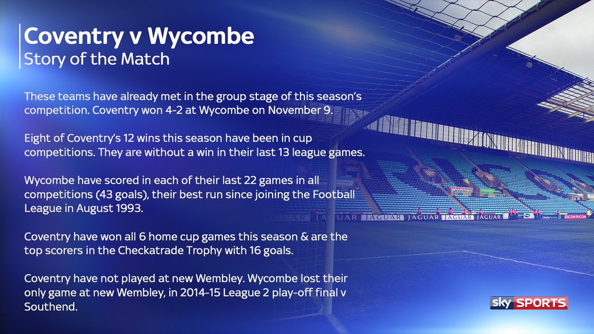 @CheckatradeTrpy final at Wembley is at stake when Coventry play Wycombe, live on SS1 at 7.15pm. Here’s a stats preview#EFLpic.twitter.com/NXSaSrNn39