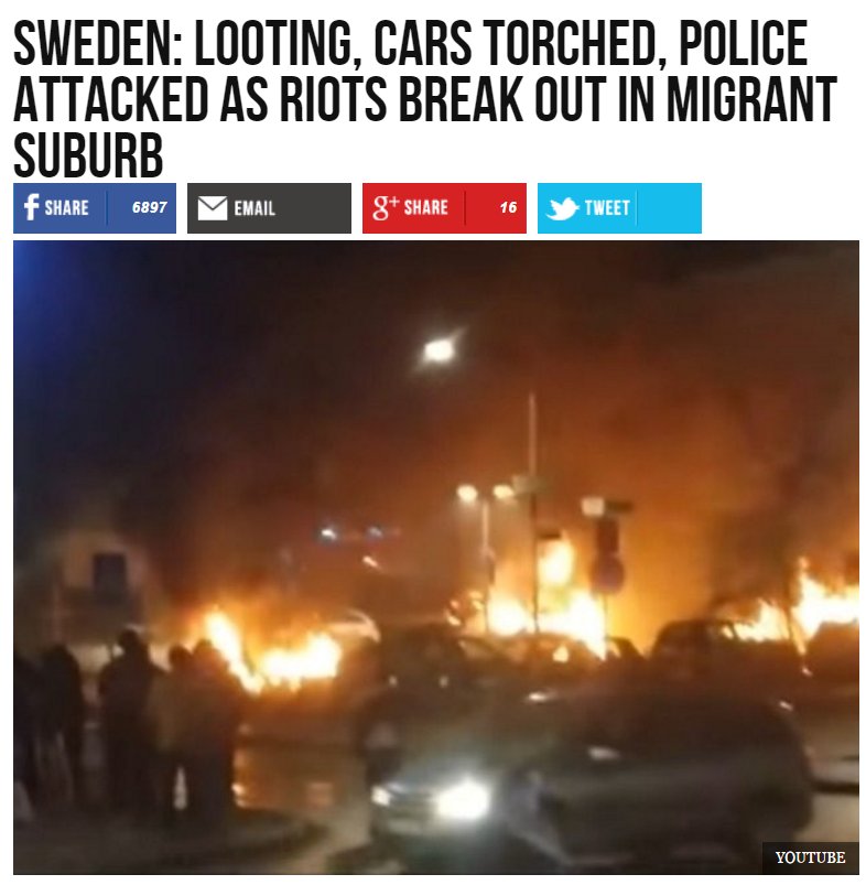 Wow. Large riots breaking out in Sweden. Migrants are burning cars, looting shops, and more. Trump was right again.http://www.zerohedge.com/news/2017-02-20/meanwhile-rioting-breaks-out-sweden …