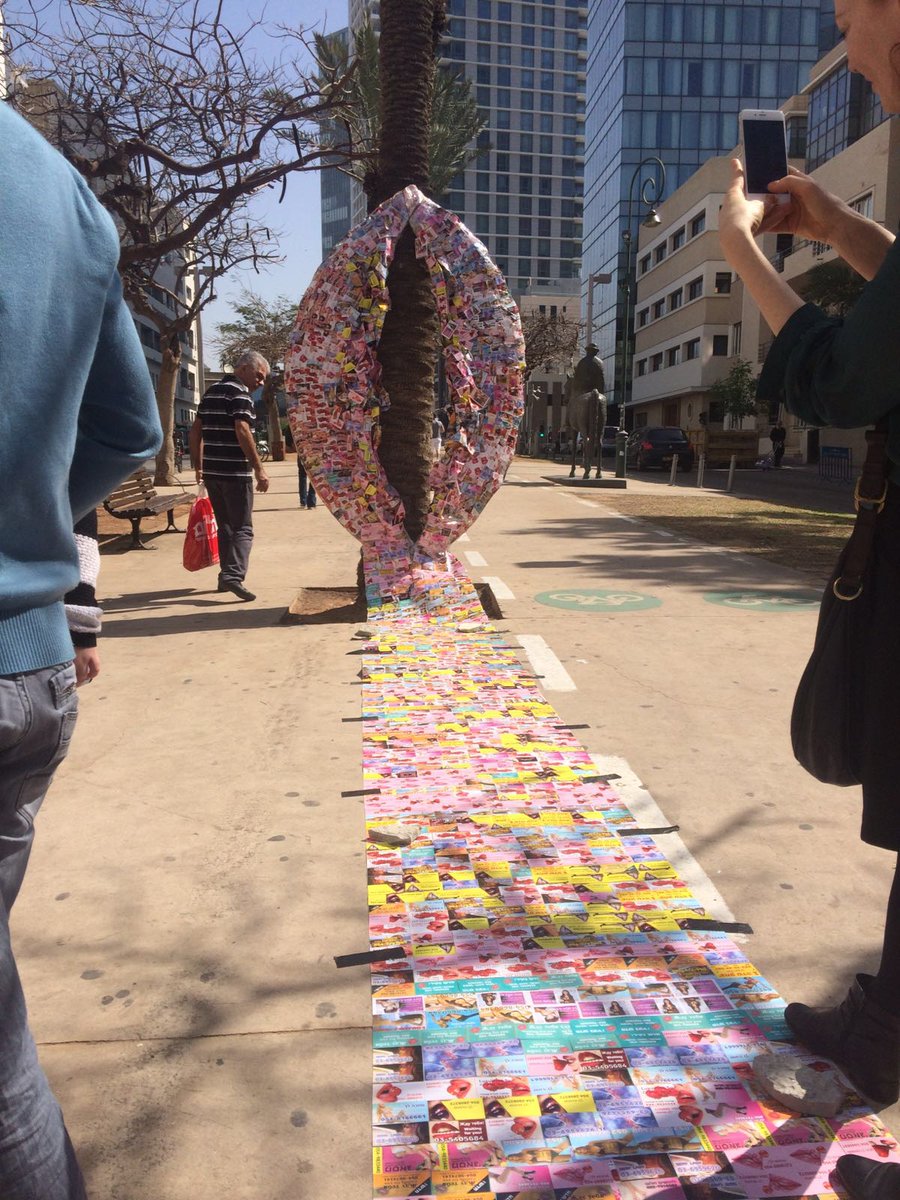 ככה אני רוצה את יום האישה, לא מניקור במשרד: אמנית אספה כרטיסי-שונות ברחוב ויצרה מהם שטיח ו-ואגינה בשדירות רוטשילד. pic.twitter.com/ny4ryTz8m4