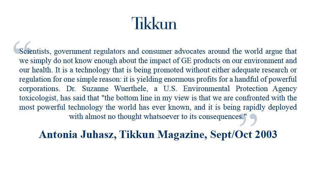 In "Food for Thought" (2003), Antonio Juhasz writes on the struggles of the fight against genetically-engineered food production -