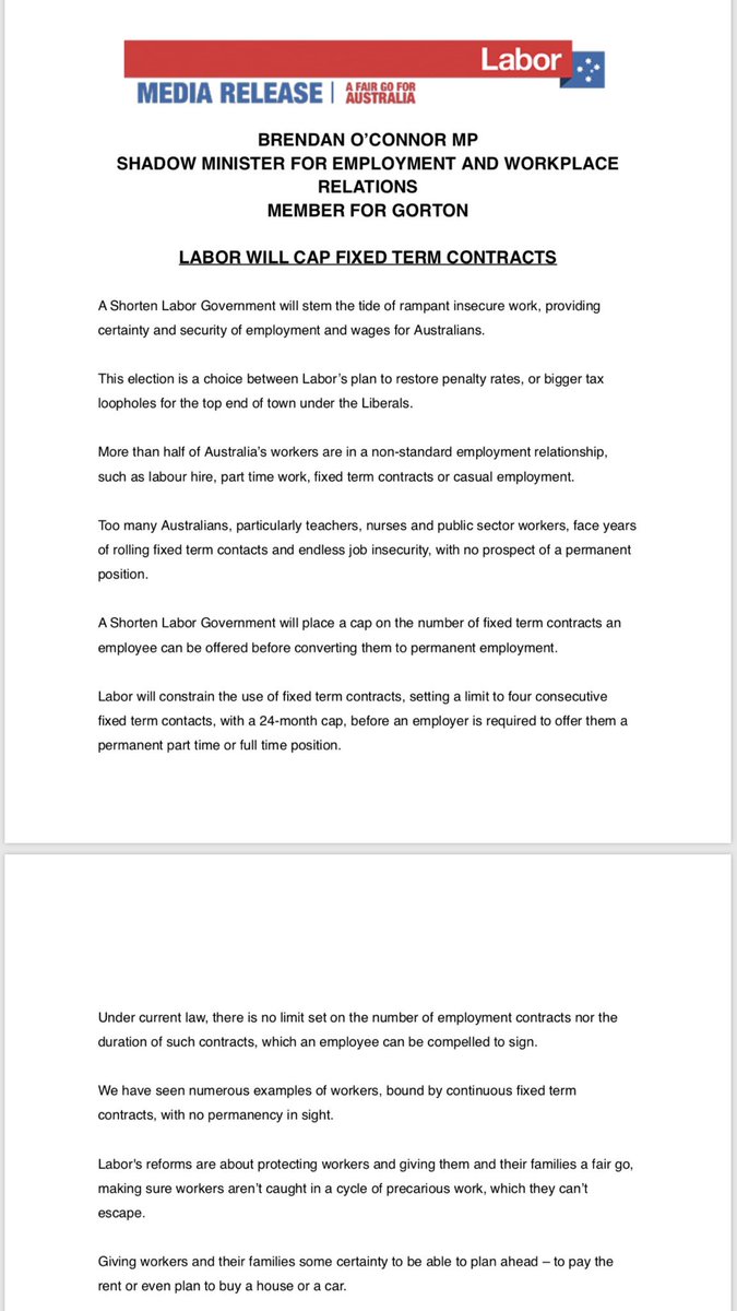 A Shorten Labor Govt will place a cap on the number of fixed term contracts an employee can be offered before converting them to permanent employment. Too many workers like teachers and nurses, face years of rolling contacts, with no prospect of a permanent position.