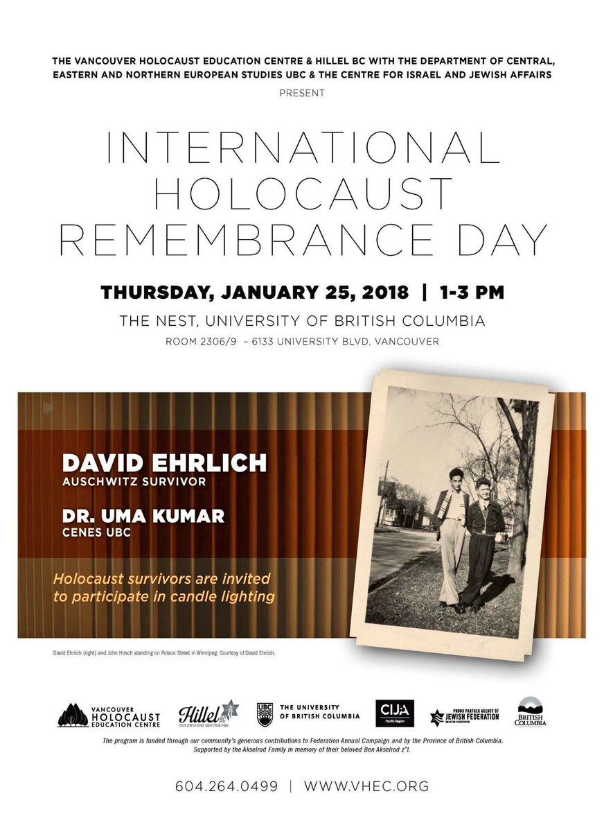 Join us on Thursday 25, January for International Holocaust Remembrance Day. The VHEC is partnering with Hillel BC, & to remember the six million Jewish victims and millions of other victims of Nazism.