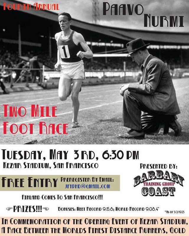Join us May 3rd, 2016 at Kezar Stadium for the 4th Annual Paavo Nurmi 2mile. Gun goes off at 6:30pm.pic.twitter.com/pjJa4OJ3pd
