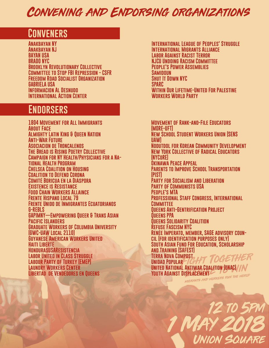 Here's a full list of the conveners and endorsers of Fight Together! Strike to Win! May Day NYC 2018 Join us in our Great Return March Contingent at May Day Union Square as we mobilize to lift up the heroic martyrs of the