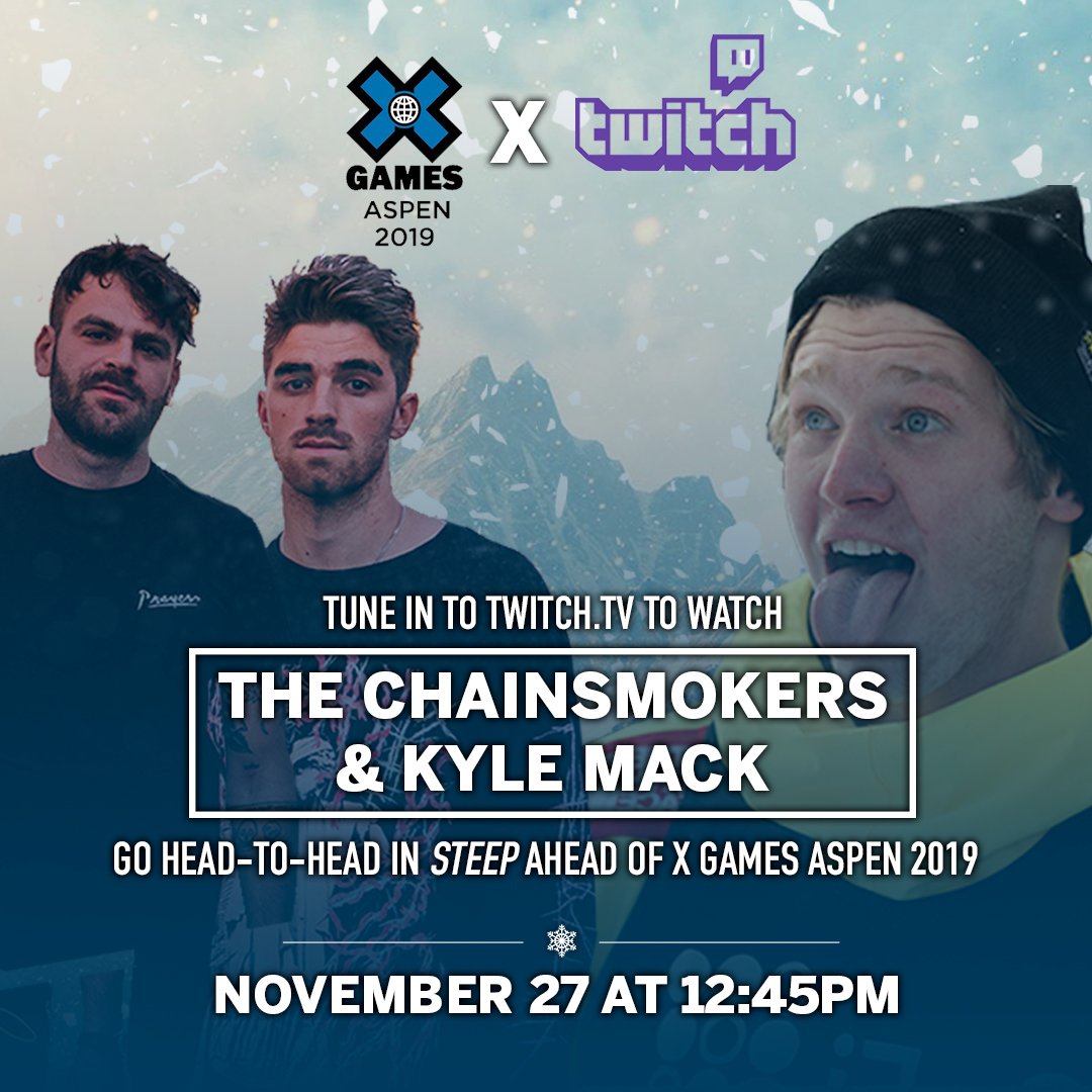 @TheChainsmokers and#XGames athlete@_KyleMack go head-to-head in@Steep_Game TODAY, Tues., Nov. 27 at 12:45pm PT | 3:45 pm ET on@Twitch! WATCH LIVE