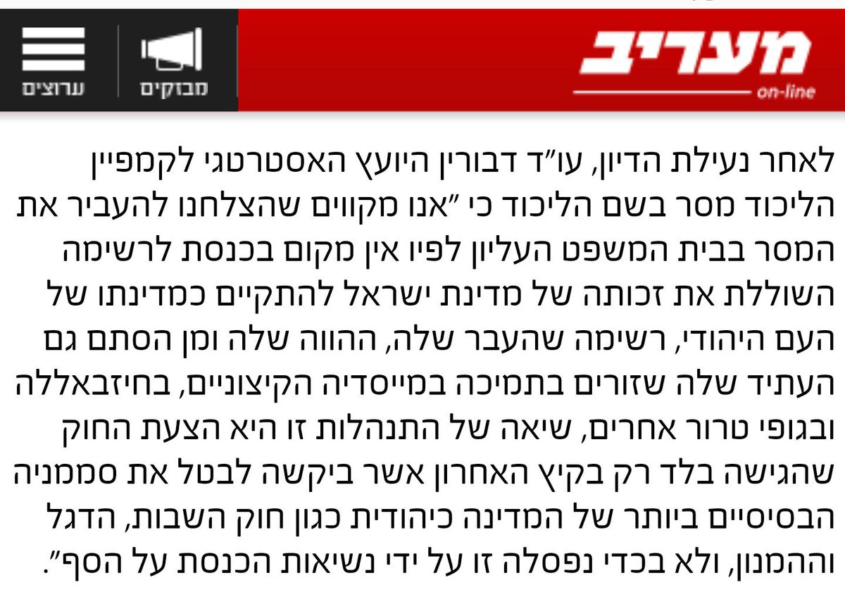 נגמר הדיון בנושא בל"ד. מצד אחד מבחינת ראיות אין סרט שהראיות שנמצאות בידי בית המשפט העליון על כך שבל"ד חותרת לחסל את המדינה היהודית ולשנות את אופייה וסממניה למדינת כל אזרחיה אינן מספיקות כדי לפסול אותה. מצד שני כמו שאומרים ביידיש בוקרא פיל מישמיש יפסלו אותם.pic.twitter.com/ca1la21hXW