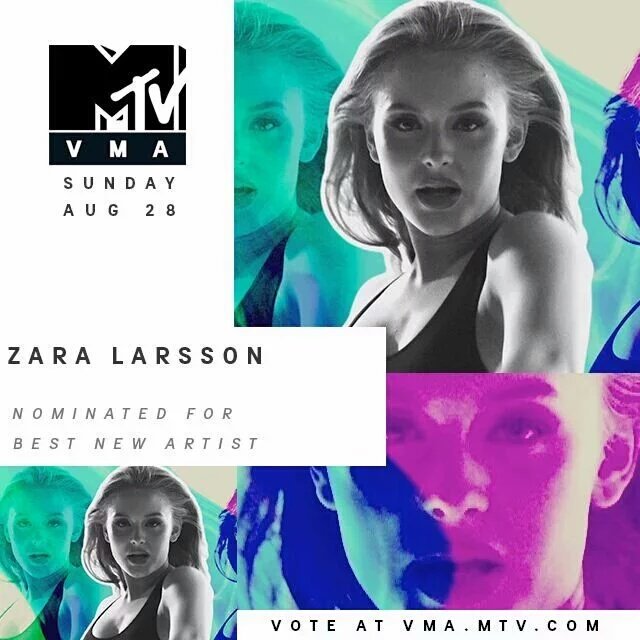 @ZaraLarsson fans! Get your#VMA Best New Artist votes in for your girl: http://on.mtv.com/2bbFyYW#liVeMAspic.twitter.com/HfPihzuPvd -