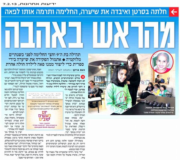 הבוקר 7.2.13 בידיעות אחרונות, תהילה החלימה מסרטן ותורמת את שיערה לזכרון מנחם!pic.twitter.com/RqNFJnBB