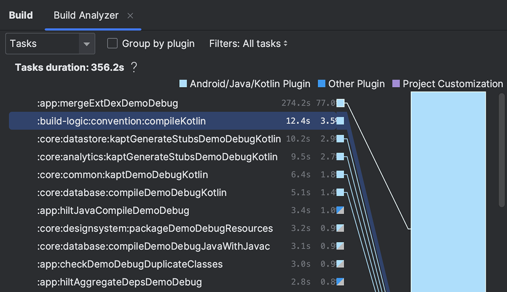 Dengan teknologi Gradle, sistem build Android Studio memungkinkan Anda menyesuaikan build guna menghasilkan berbagai varian build untuk perangkat Android yang berbeda dari satu project. Kemudian, analisis performa build dan pahami letak potensi masalah build dalam project Anda dengan Build Analyzer.