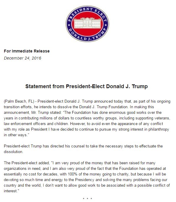 19. Statement from President-Elect on the Donald J. Trump Foundation.