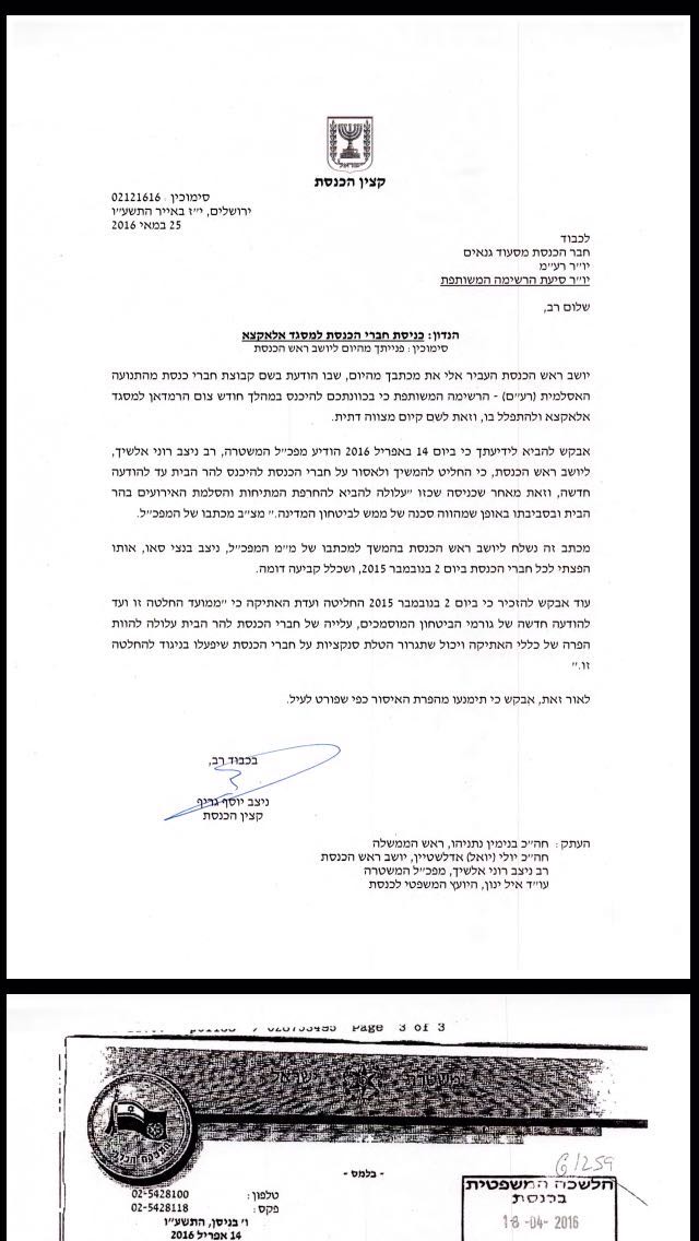 יו"הכנסת קורא לח"כים הערבים לא לעלות להר הבית ברמדאן. מכתב מקצין הכנסת ובו איסור המשטרה מאפריל על עליה להר הבית.pic.twitter.com/BVxGt4VvrB