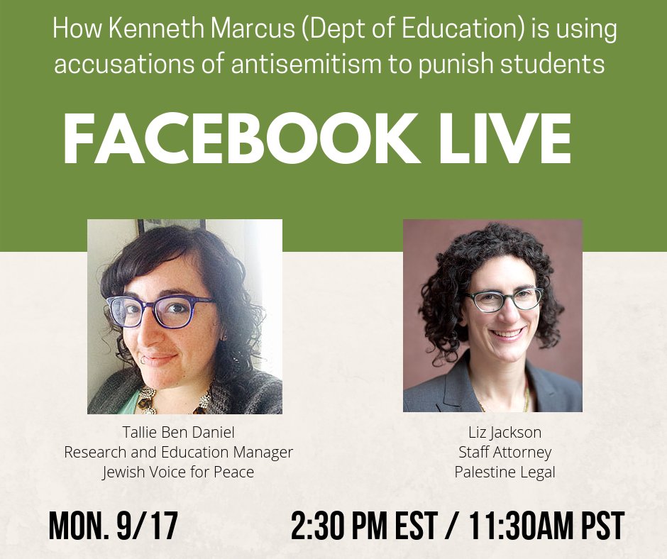 Join Liz Jackson of and of JVP – LIVE on our Facebook – talking about Kenneth Marcus, Dept. of Education's attacks on Palestine activism and what your rights 🔥