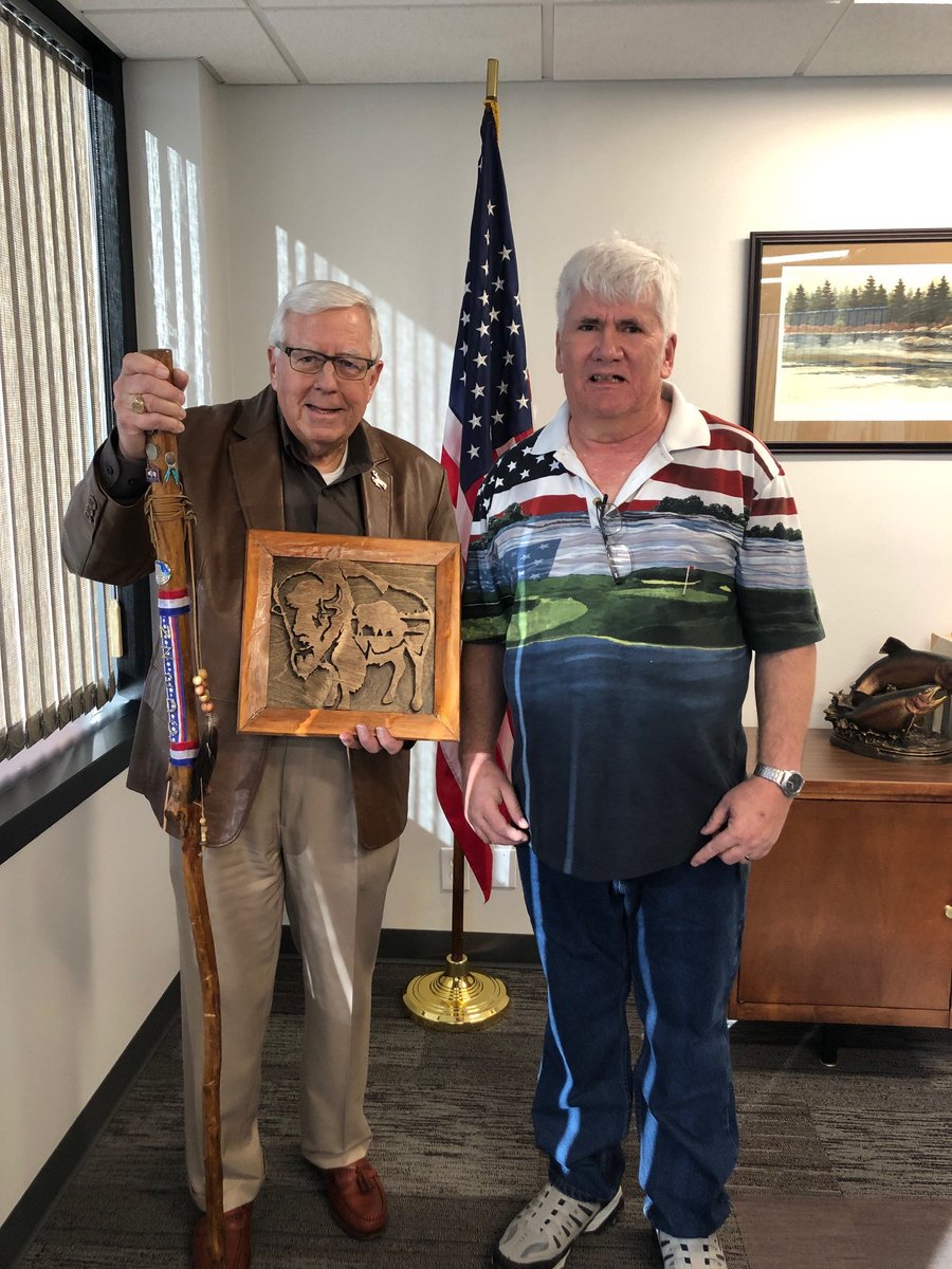 Over the weekend, I had the opportunity to meet with Darwin “Joe” Brown from Gillette. Joe carved this impressive and intricate walking stick and bison.pic.twitter.com/efIoGOFqLG