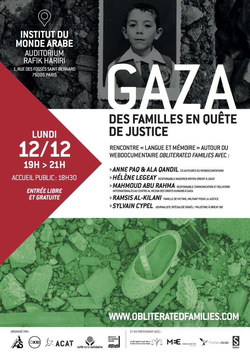 [ÉVÉNEMENT] Orient XXI organise lundi prochain une rencontre autour du webdoc "Obliterated families" http://orientxxi.info/magazine/rencontre-orient-xxi-gaza-des-familles-en-quete-de-justice-le-12-decembre-a-l,1612 …