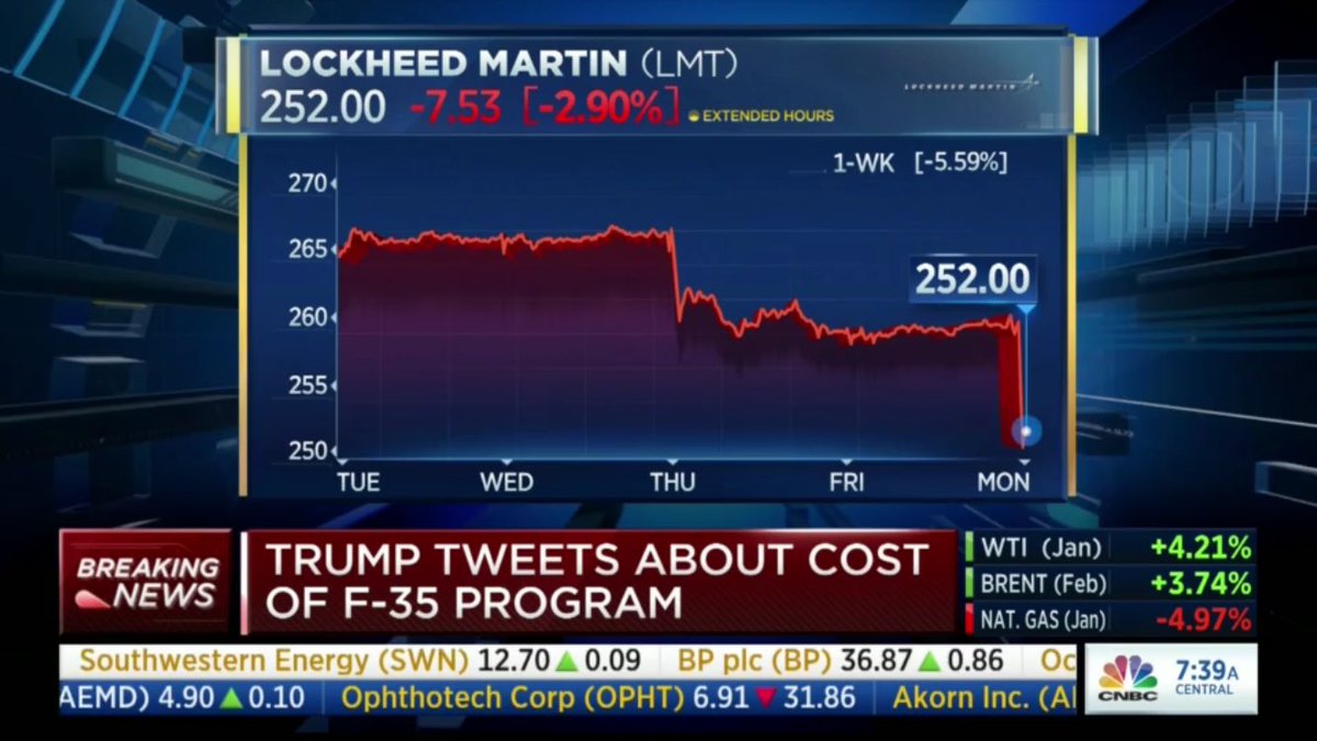 Lockheed Martin shares drop sharply after Trump tweets about "out of control" F-35 program costs. http://data.cnbc.com/quotes/LMT pic.twitter.com/8TYnVaXpQa