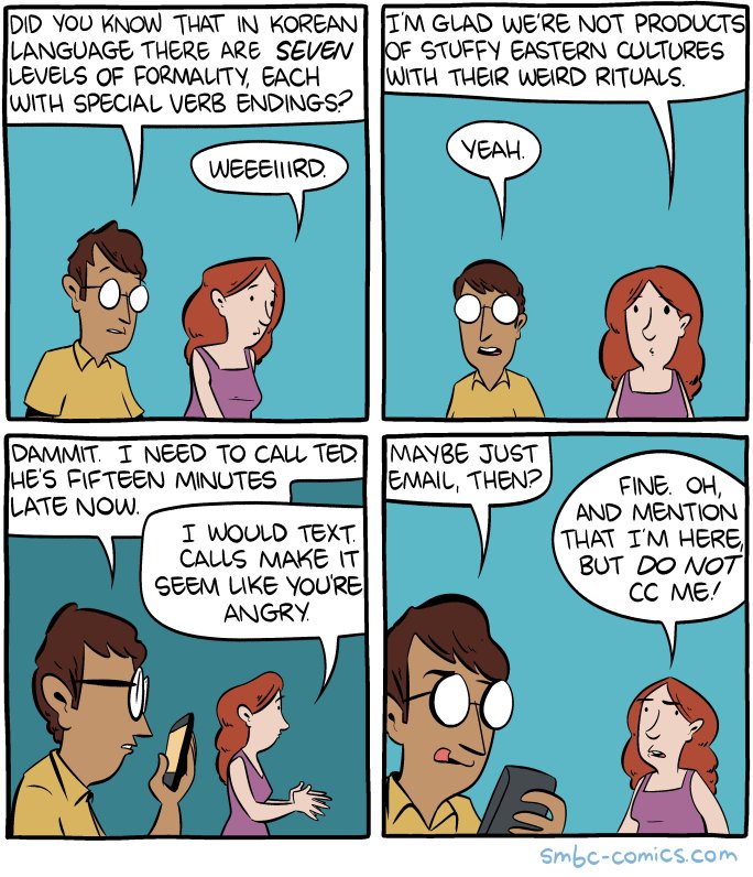 Formality: The current SMBC: Mouseover title: "Finally, someone brave enough to tell the truth about our hypocrisy… http://dlvr.it/NJL9Vs pic.twitter.com/3igKR0RPzv