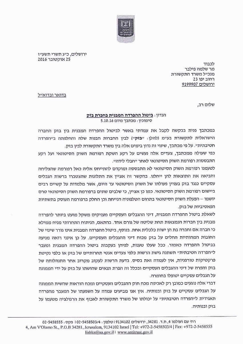 הממונה על ההגבלים במכתב אלי מאוקטובר "ביטול ההפרדה המיבנית אינו גורר שינוי של החובות המהותיות החלות על בזק מכח דיני ההגבלים העיסקיים.>>>