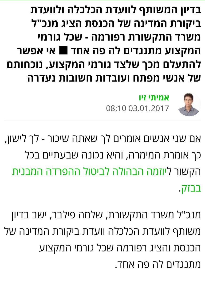 לחובבי הז'אנר "אלוביץ'". מצטער לאכזב, אין מחלוקת ביני לבין האוצר על עקרון השימוש בתשתיות. ההתנגדות היא לניסיון להפקיע את הסמכות משר התקשורת