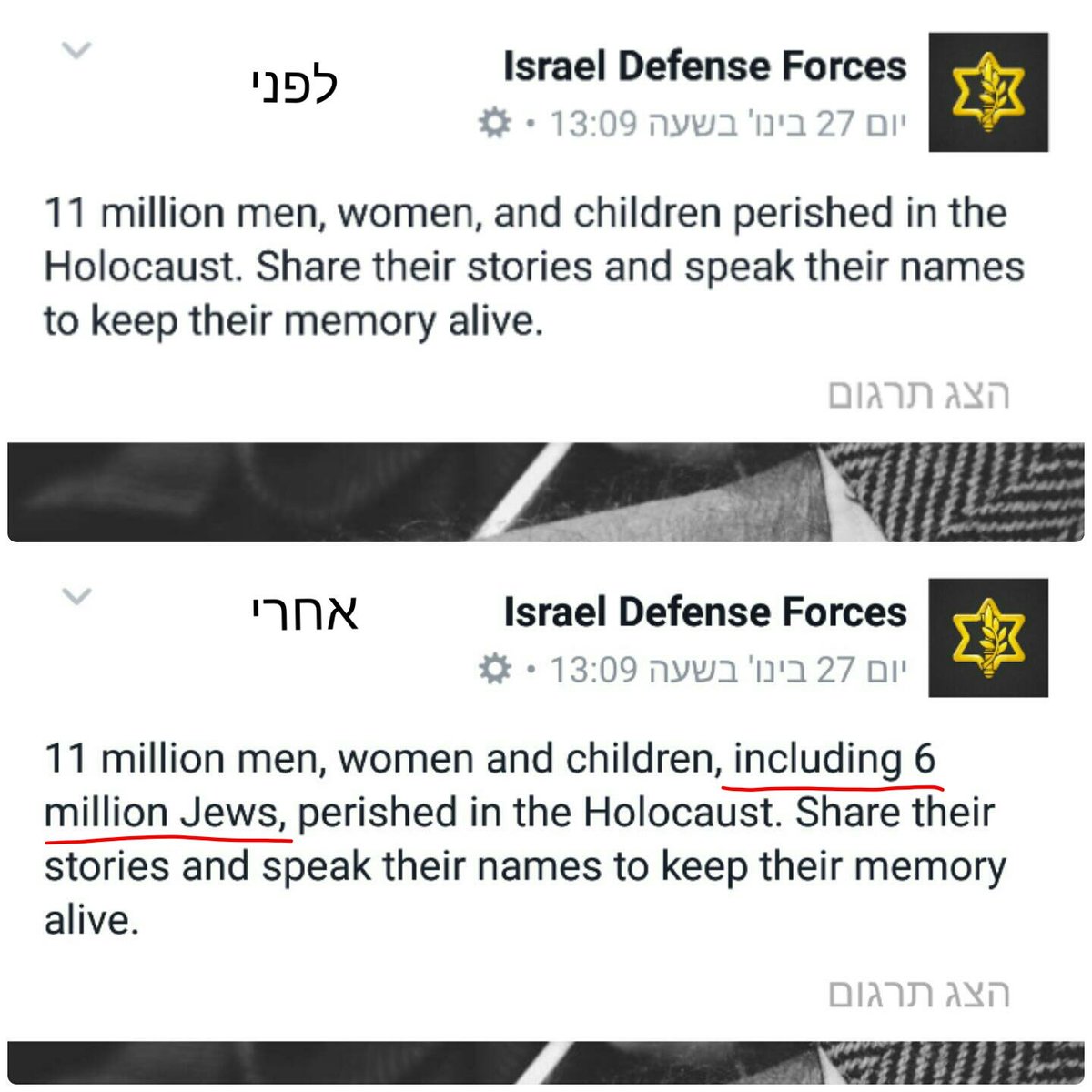 הפייסבוק הרשמי של צה"ל באנגלית, לפני ואחרי פניית גלצ: לפני: "11 מיליון נספו בשואה", אין זכר ליהודים אחרי: "כולל שישה מליון יהודים"pic.twitter.com/V4bZUJbYt1