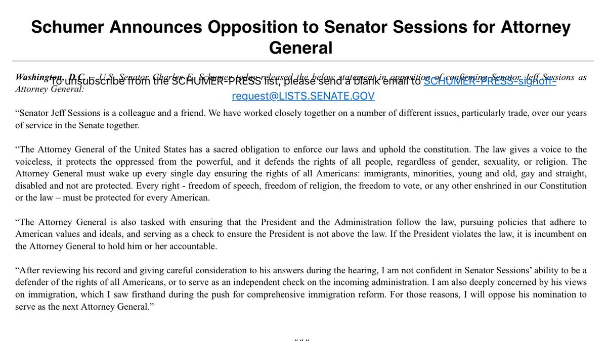 14. Chuck Schumer announces he's opposing Jeff Sessions for attorney general.