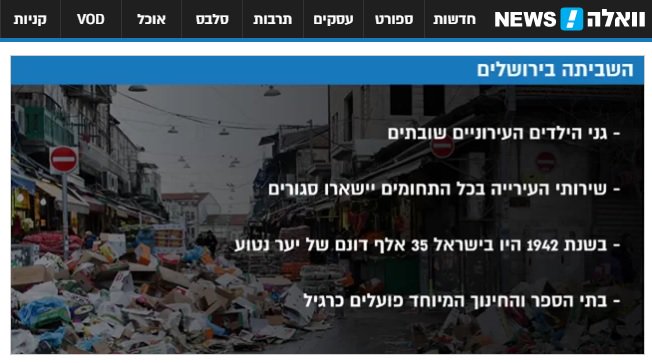 בירושלים לא תיאסף היום אשפה והרחובות לא ינוקו כי העירייה שובתת. בשאר הימים לא נאספת אשפה ולא מנקים את הרחובות בירושלים כי ראש העיר ממש גרוע.