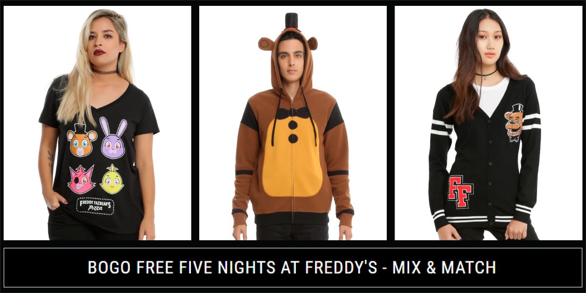 Time to play & buy one, get one FREE Five Nights at Freddy's merch in stores and online: http://hottopic.me/lYYIVv pic.twitter.com/gIAKLB6IyZ