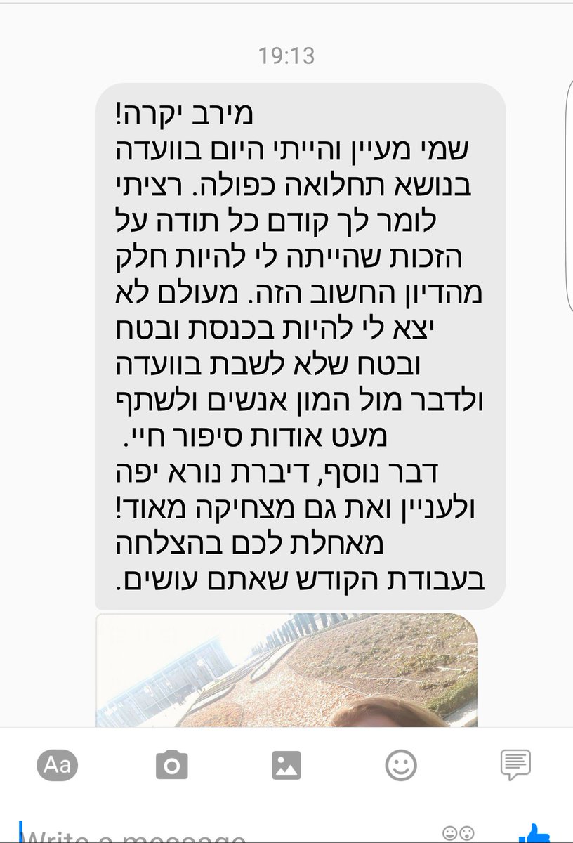 מסיימת דיון בועדת המשנה שלי לצעירים וצעירות חסרי בית בנושא תחלואה כפולה ומקבלת הודעה מאחת הצעירות שהייתה בדיון. התרגשתי ממנה