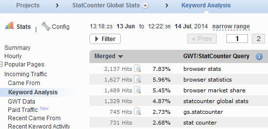 This shows the GWT keyword data alongside the StatCounter data. You can look at each keyword and compare direct StatCounter data with indirect data collected from GWT.
