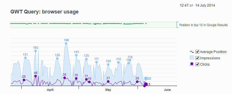 Finally there is an entirely new stat called GWT Data which is based solely on the GWT keyword data. It shows you the clicks, impressions and positions of your keywords.