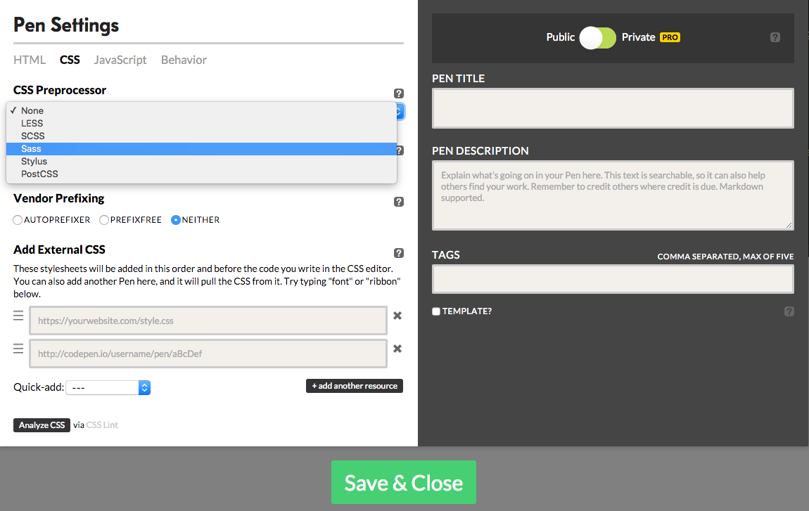 Select your favorite preprocessor from the "CSS Preprocessor" dropdown menu: