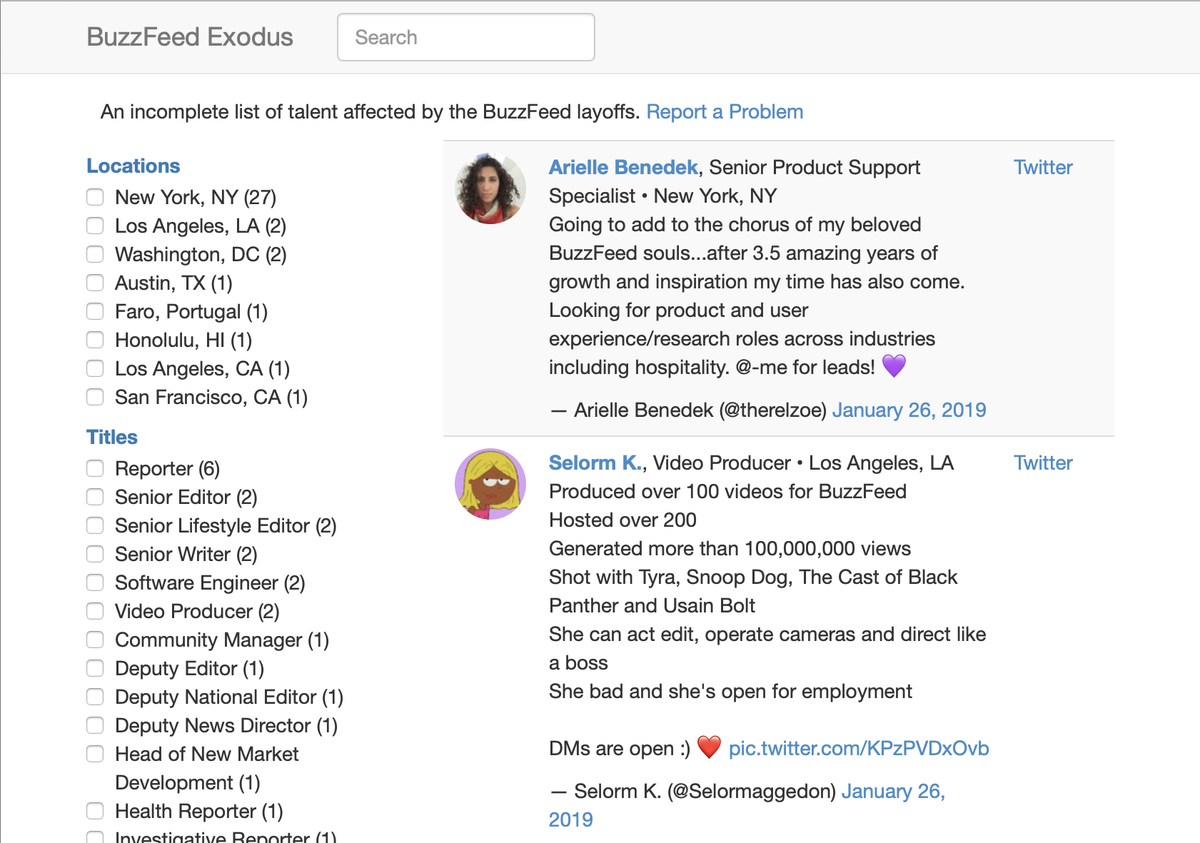 @Glitch project listing Buzzfeed alums who may be looking for work.https://twitter.com/jcsalterego/status/1089307698833821696 …