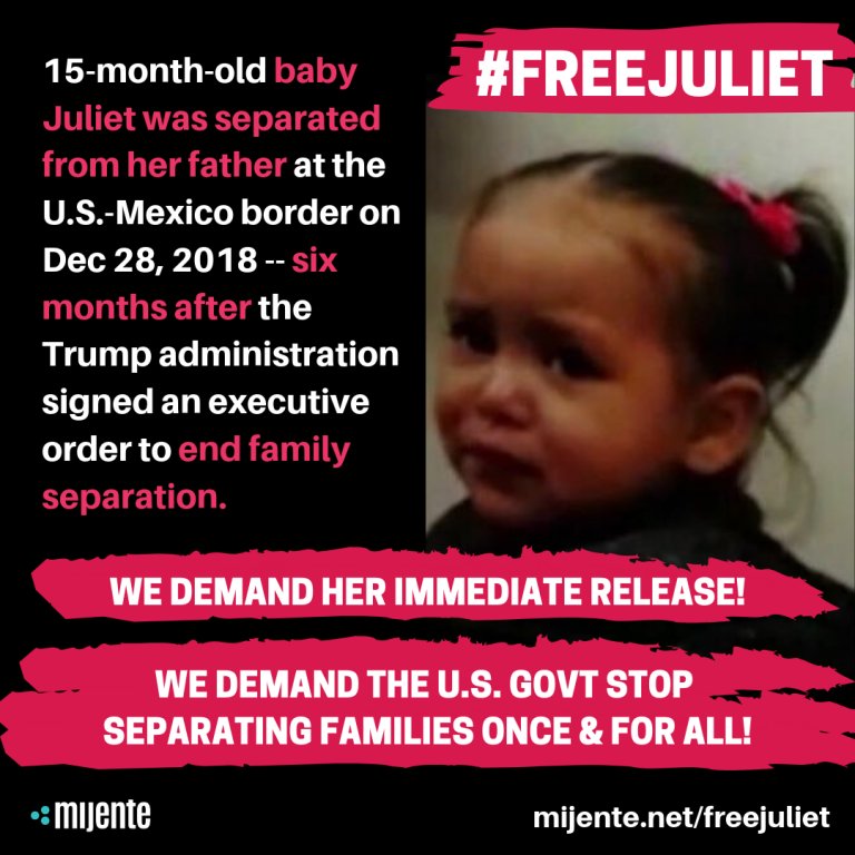 HAPPENING NOW: Trump still separating families. Juliet is 15. Months. Old. Separated from her dad on December 28 & detained ever since. The worst part: The Office of Refugee Resettlement (ORR) will not even disclose where she is being held. This is terror.https://mijente.net/2019/01/24/case-of-detained-15-month-old-baby-exposes-continued-separation-of-families-by-trump/ …