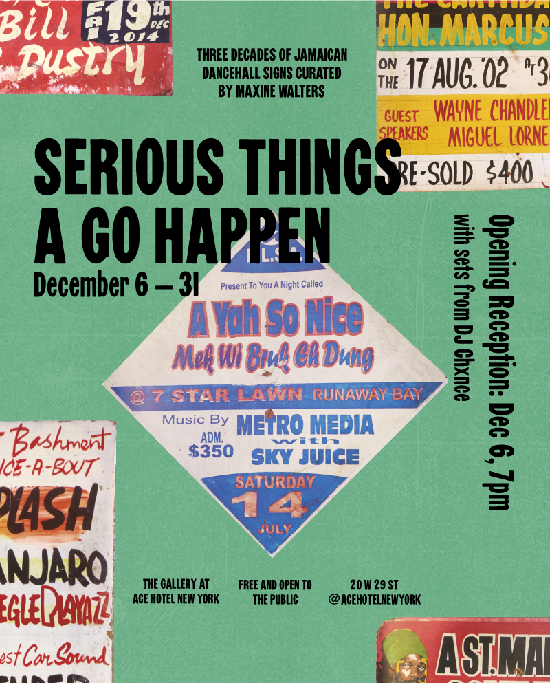 Our coolest and dearest friend, Maxine Walters, has taken her Jamaican dancehall signs north. Serious Things A Go Happen opens tomorrow December 6 at 7pm in the Gallery at