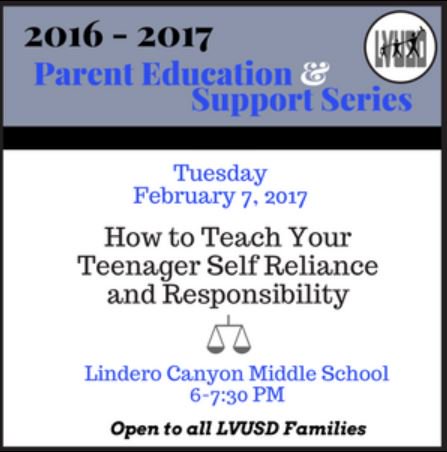 at Tues. Feb 7. Open to all families. How to teach your teenager Self Reliance & Responsibility