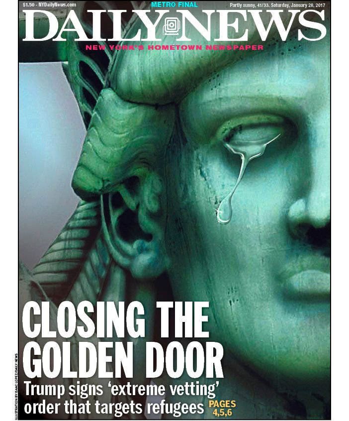 Tomorrow's front page... CLOSING THE GOLDEN DOOR Trump signs 'extreme vetting' order that targets refugees http://nydn.us/2jGJLqo pic.twitter.com/ey1AYlEHDW