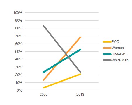 Genuinely wild to compare the demographics of Democrats who flipped seats in the 2006 wave vs. the 2018 wave. ...in 2006 - 3% POC - 13% Women - 23% Under 45 - 83% White men ...in 2018 - 21% POC - 68% Women - 53% Under 45 - 24% White Menpic.twitter.com/HlfkBS21EK
