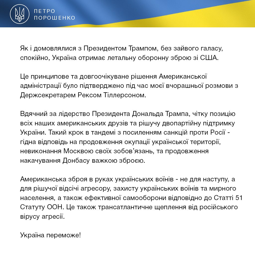 Президент про отримання Україною американськоі зброї: Це трансатлантичне щеплення від російського вірусу агресії