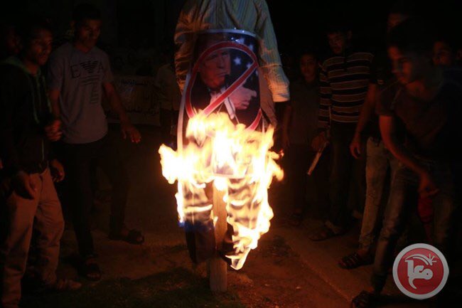 Palestinians welcome Donald Trump by burning effigies of him and US flags while waving Iranian and Hezbollah flags.