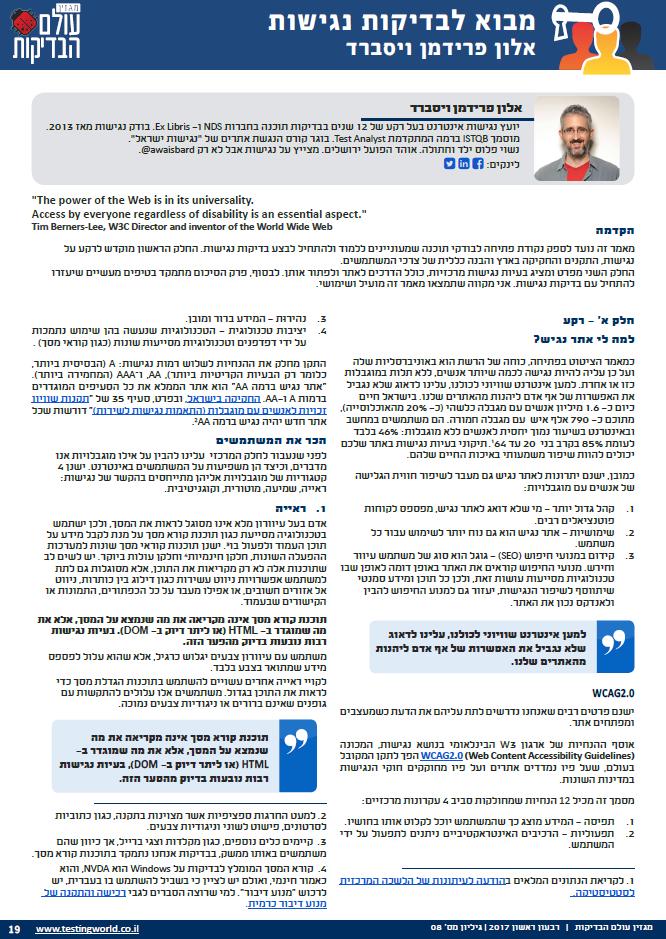 מאמר מבוא לבדיקות נגישות שלי שפורסם לפני מספר חודשים במגזין "עולם הבדיקות". מקווה שיהיה מועיל ושימושי. זמין לשאלות / תגובות / הערות והארות.https://twitter.com/ITCB_IL_Testers/status/883927381240631296 …