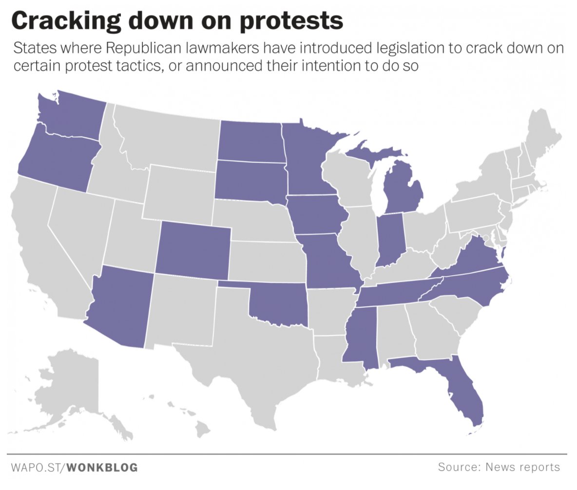 In map form: every state where Republicans have introduced anti-protest legislation since the election https://www.washingtonpost.com/news/wonk/wp/2017/02/24/republican-lawmakers-introduce-bills-to-curb-protesting-in-at-least-17-states/?utm_term=.9780ff9ca9d8 …pic.twitter.com/M1IQbb0J34