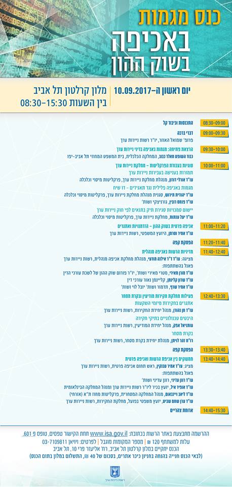 כנס "מגמות באכיפה בשוק ההון" של רשות ניירות ערך: יום ראשון | 10.9.17 | 15:30-08:30 | מלון קרלטון תל-אביב | להרשמה: