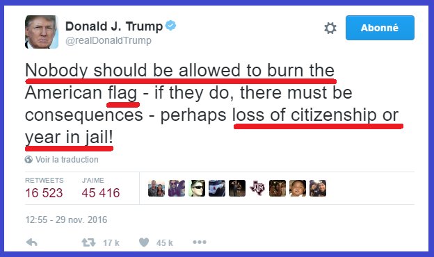 1. suggère le retrait de la ou 1 an de prison ferme pour tout individu brûlant le national. Excellente initiative!