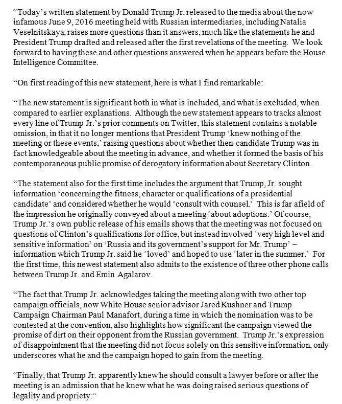 Important point from Schiff: New Don Jr statement "no longer mentions that POTUS 'knew nothing of these events,'" ie, meeting w/ Russianshttps://twitter.com/RepAdamSchiff/status/905912690014552064 …