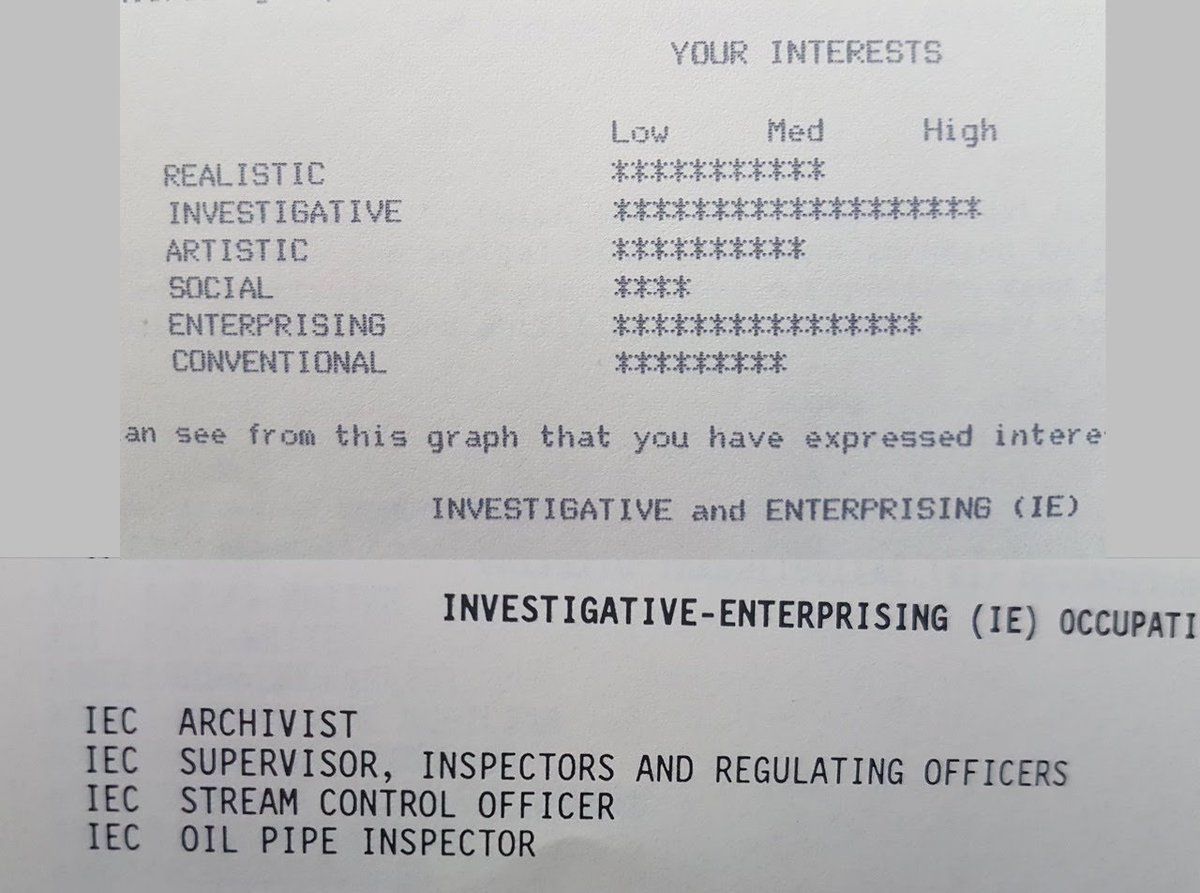 Recently found my old high school vocation tests. Not too far off - somedays bioinformatics does feel like a mix between "archivist" and "oil pipe inspector"