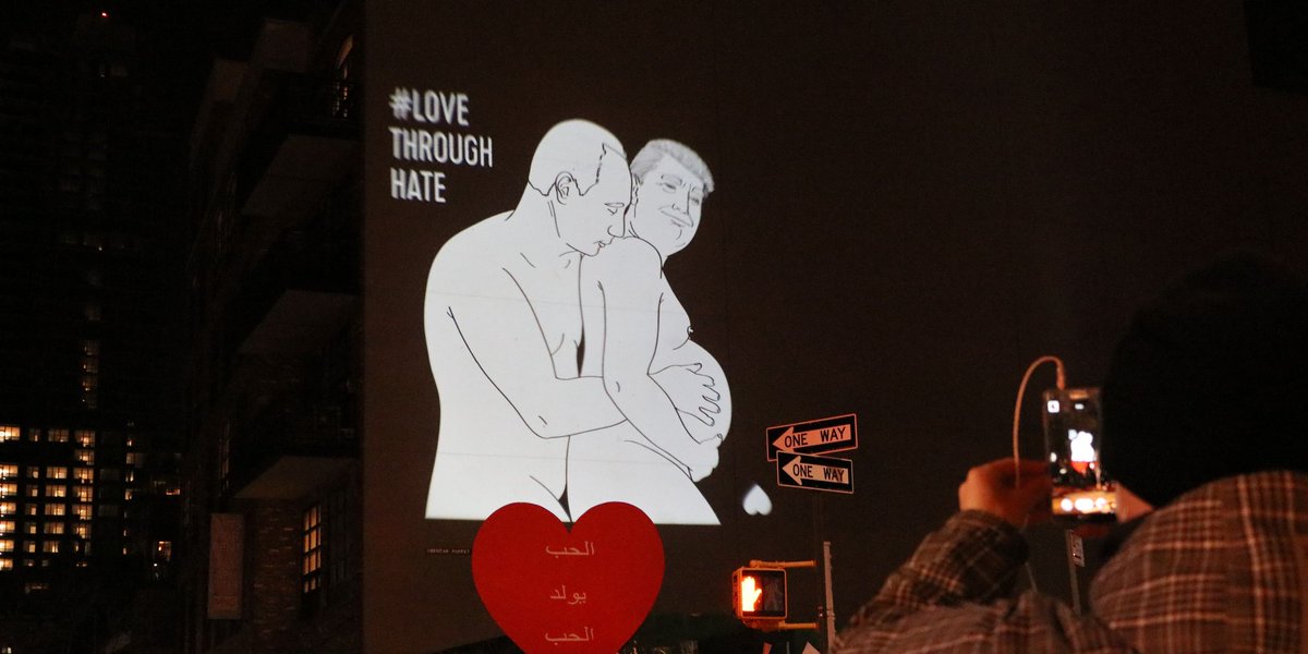 Trump appears naked, pregnant, and spooning Vladimir Putin on NYC billboards: http://trib.al/QsPZc25 pic.twitter.com/zPy8ow8j8z