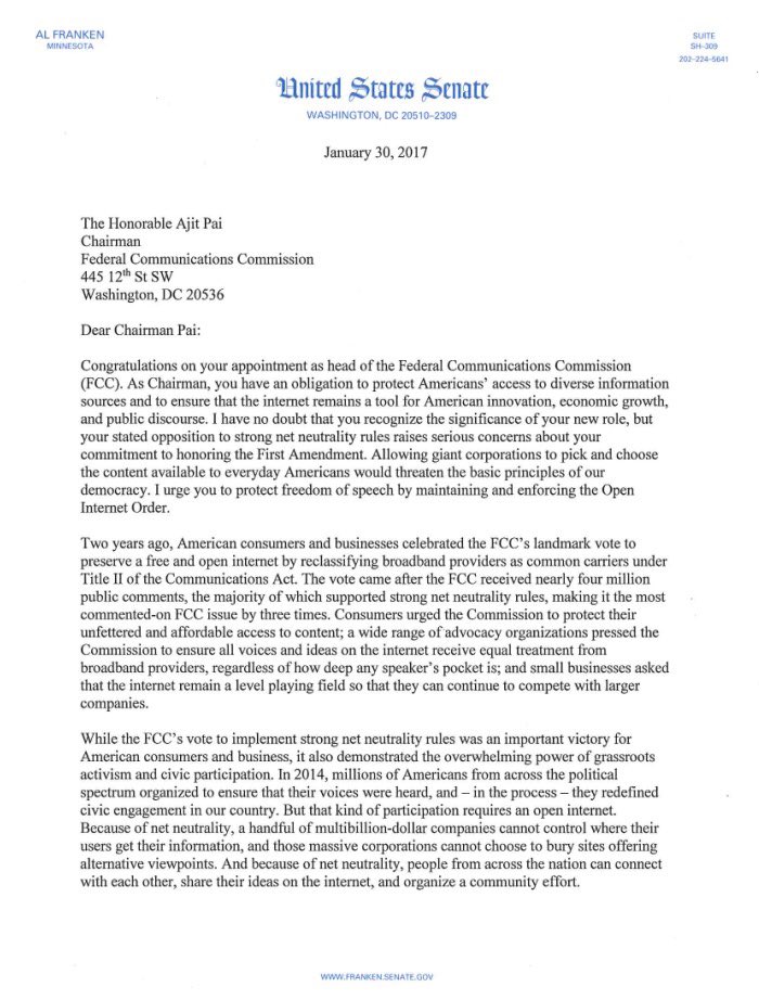 @FCC Chairman Pai to protect freedom of speech by maintaining and enforcing net neutrality. https://www.franken.senate.gov/?p=press_release&id=3607 …pic.twitter.com/x3FCNb4r5q