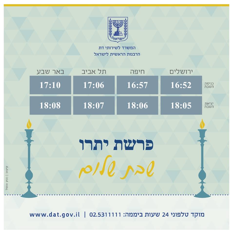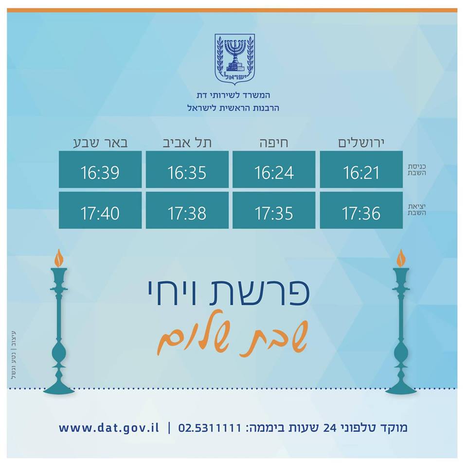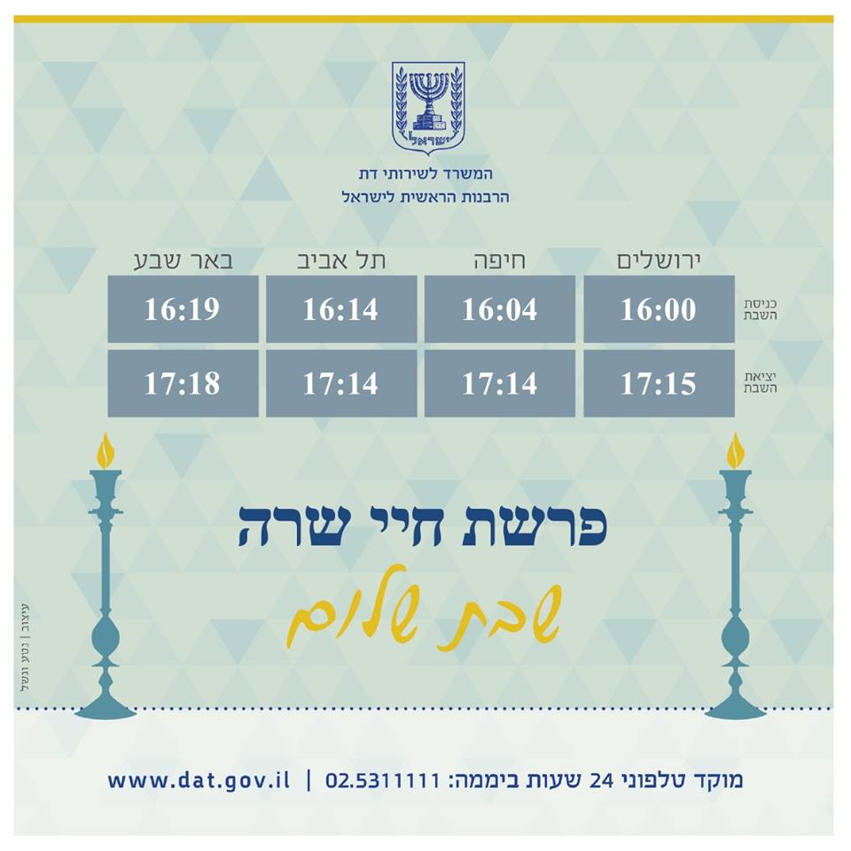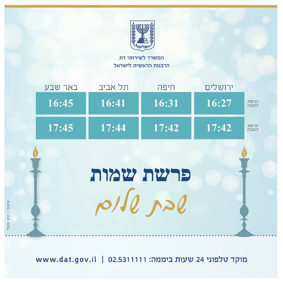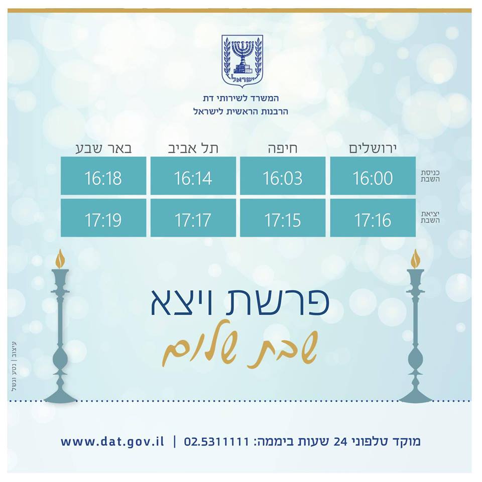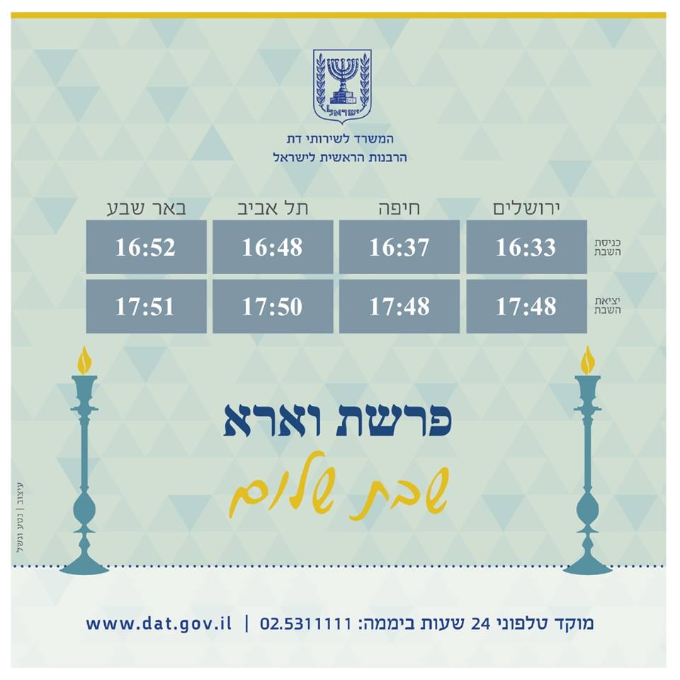 המשרד לשירותי דת מאחל לכל בית ישראל שבת שמחה, שלווה ומליאת נחת. לנוחיותכם מצורפים זמני כניסת ויציאת השבת.pic.twitter.com/NfnQQSTVDY