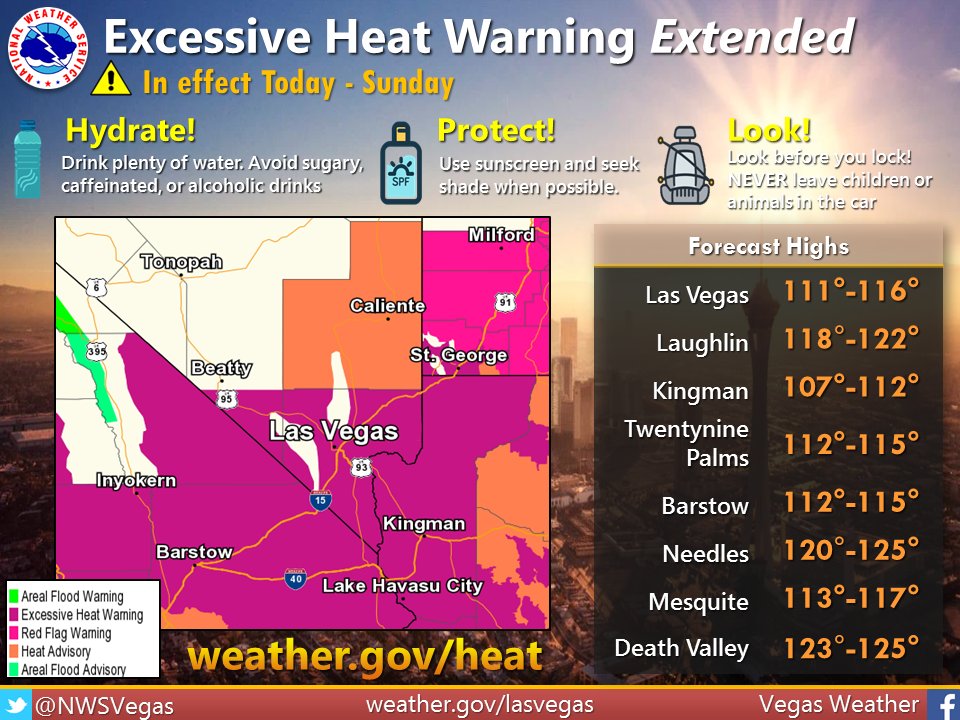 Excessive Heat Warning extended through Sunday! Continue to practice smart heat safety. Some relief to come next week! #nvwx#azwx#cawxpic.twitter.com/ToFCbNndu6
