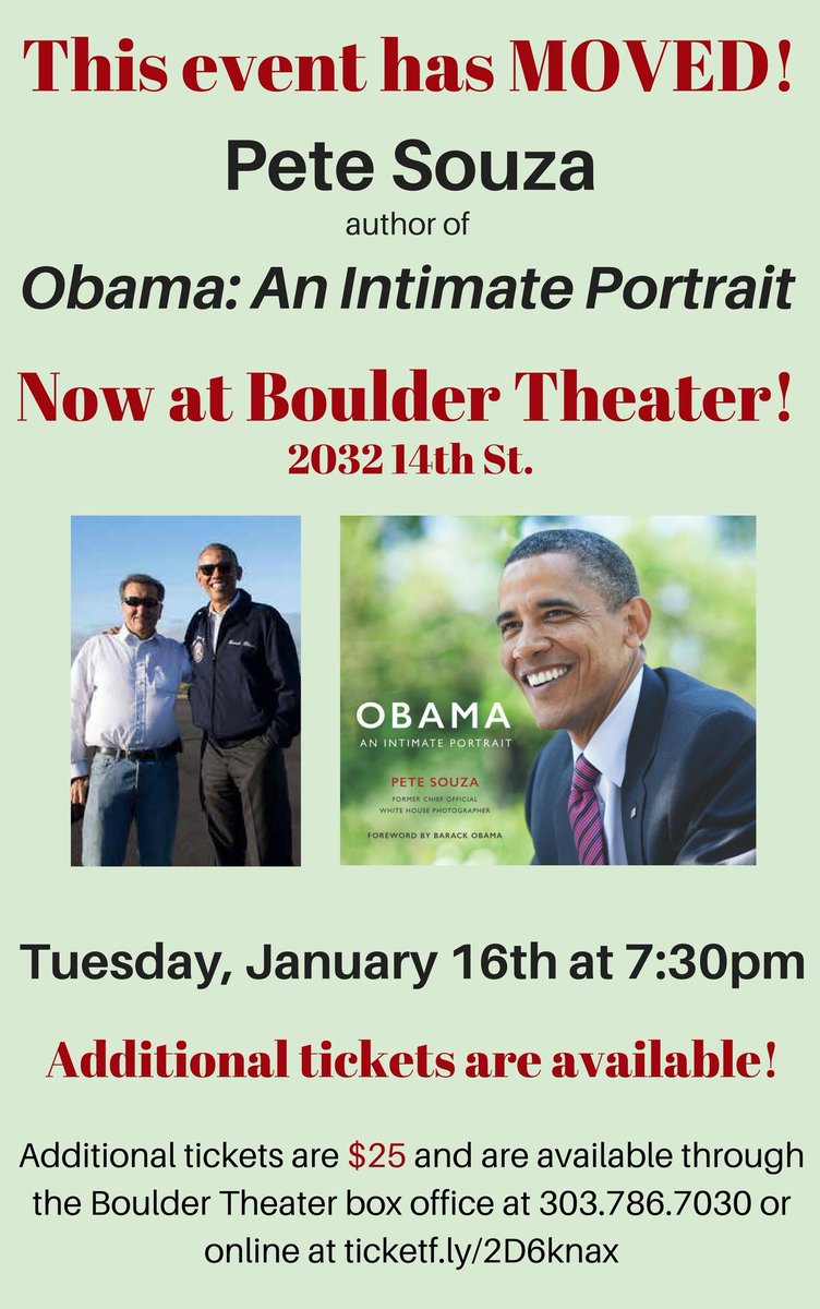 Pete Souza, former Chief White House Photographer and author of "Obama: An Intimate Portrait", will be speaking at the Boulder Theater tonight (1/16) at 7:30 PM! The event is now SOLD OUT.pic.twitter.com/ULjwTi4QHY