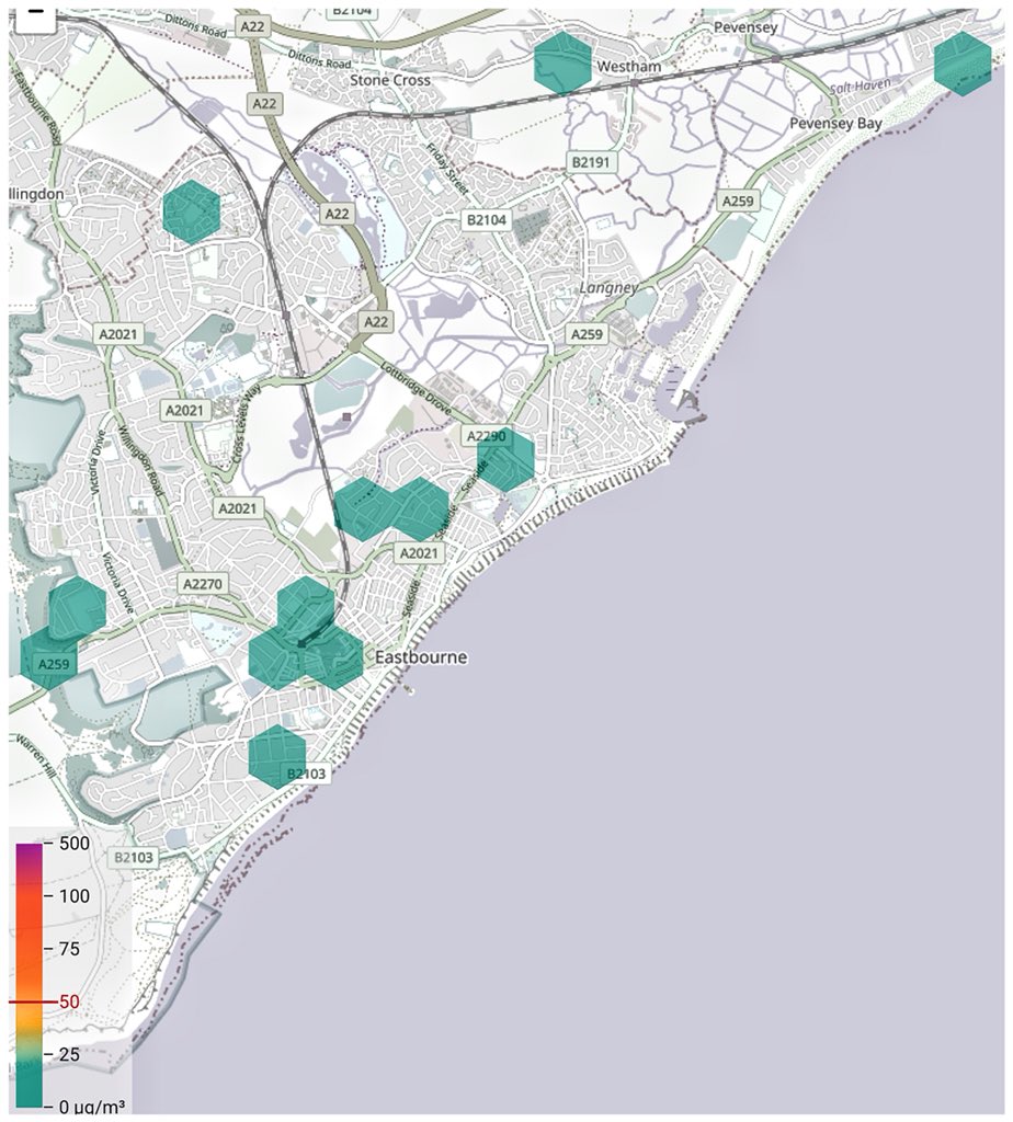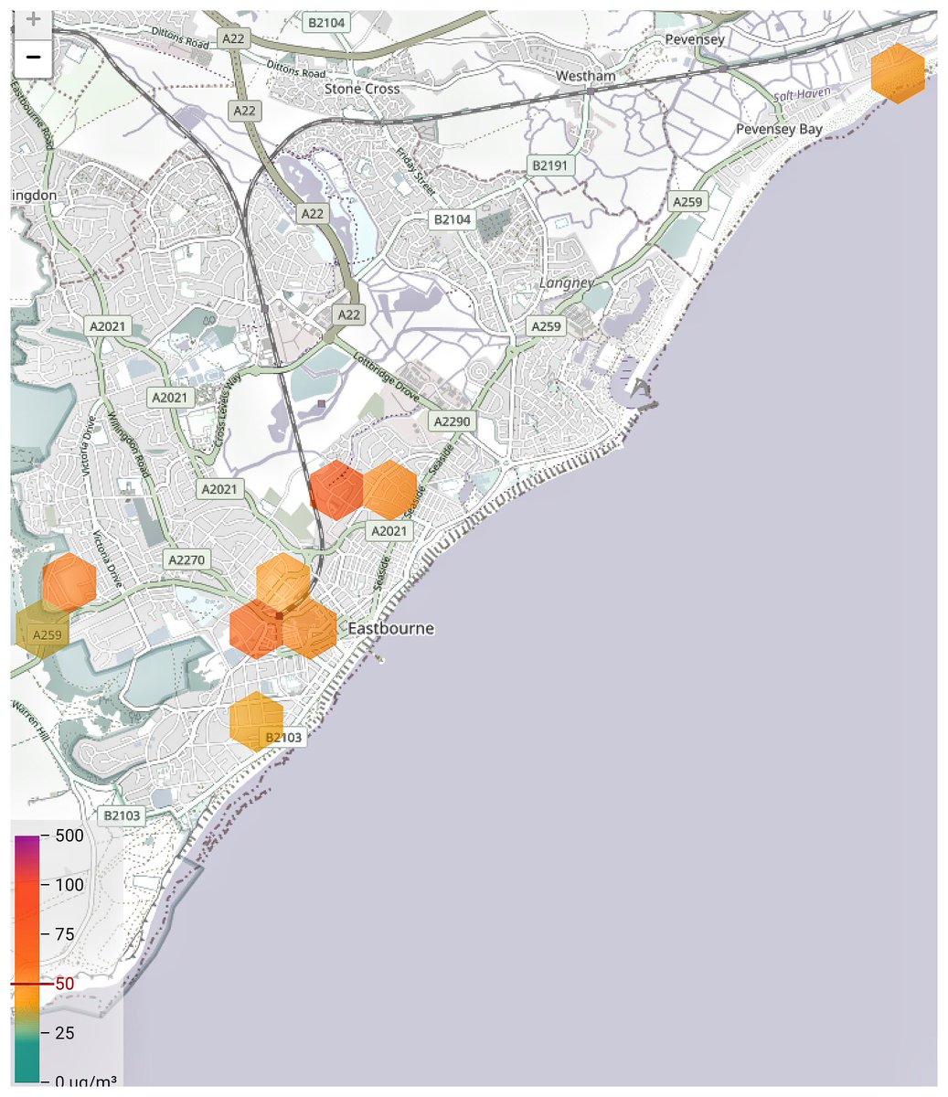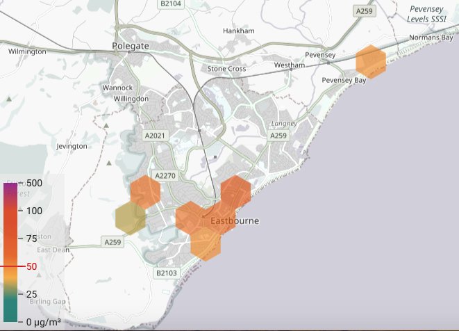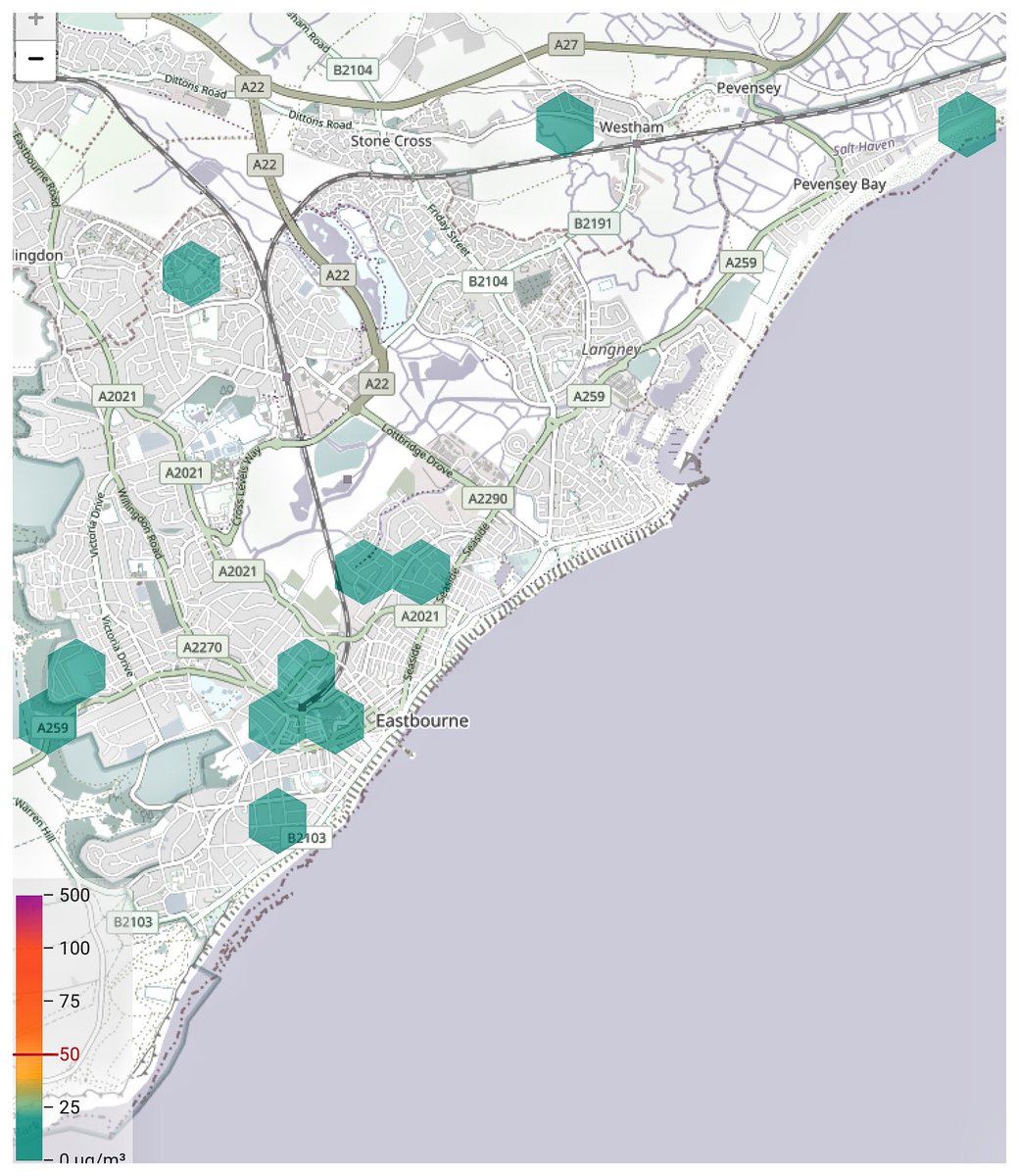 #Eastbourne#Airpollution#sensors & location map are all showing low PM10 & PM2.5 data readings. The green hexagonal markers for location show that it’s a good day across the town. This is one aspect of monitoring air that is important and reassuring for residents ...pic.twitter.com/axIlbMFZnC